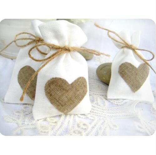 Free Shipping Burlap Heart Favor Bag Trendy White Natural Linen Drawstring Wedding Gift Bags Jewelry Bag 50pcs