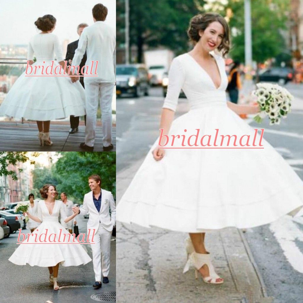 Discount Tea Length 50s Short Wedding Dresses With Pockets V Neck